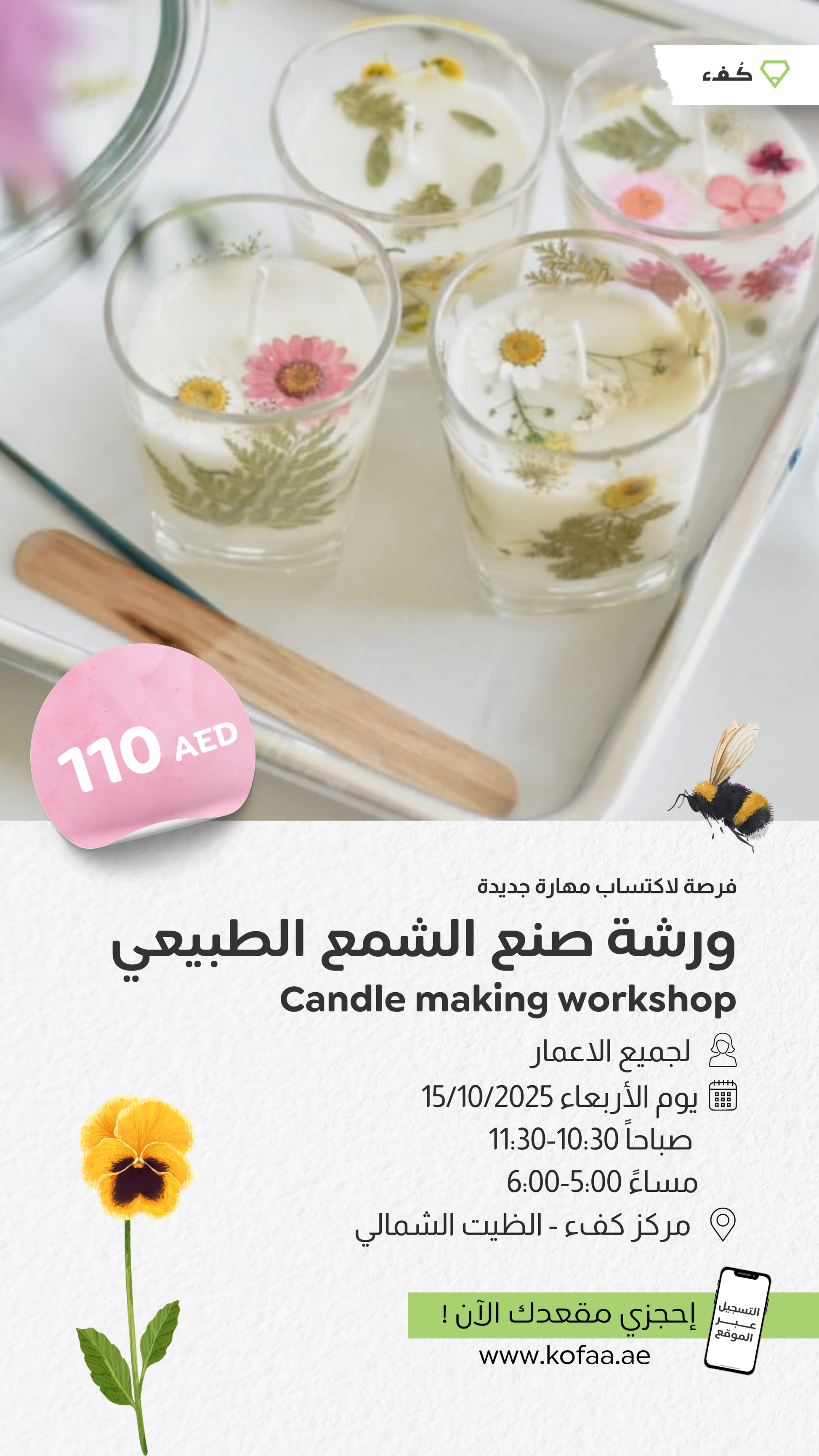 في هذه الورشة الإبداعية، ستصنعين شموعًا مبهجة تحتوي على زهور مجففة بروائح فاخرة وتصميمات أنثوية تضيف لمسة جمالية لأي مساحة.